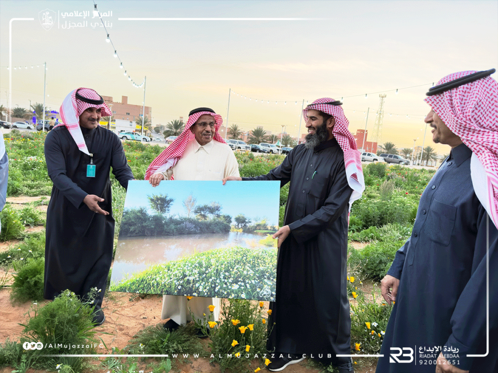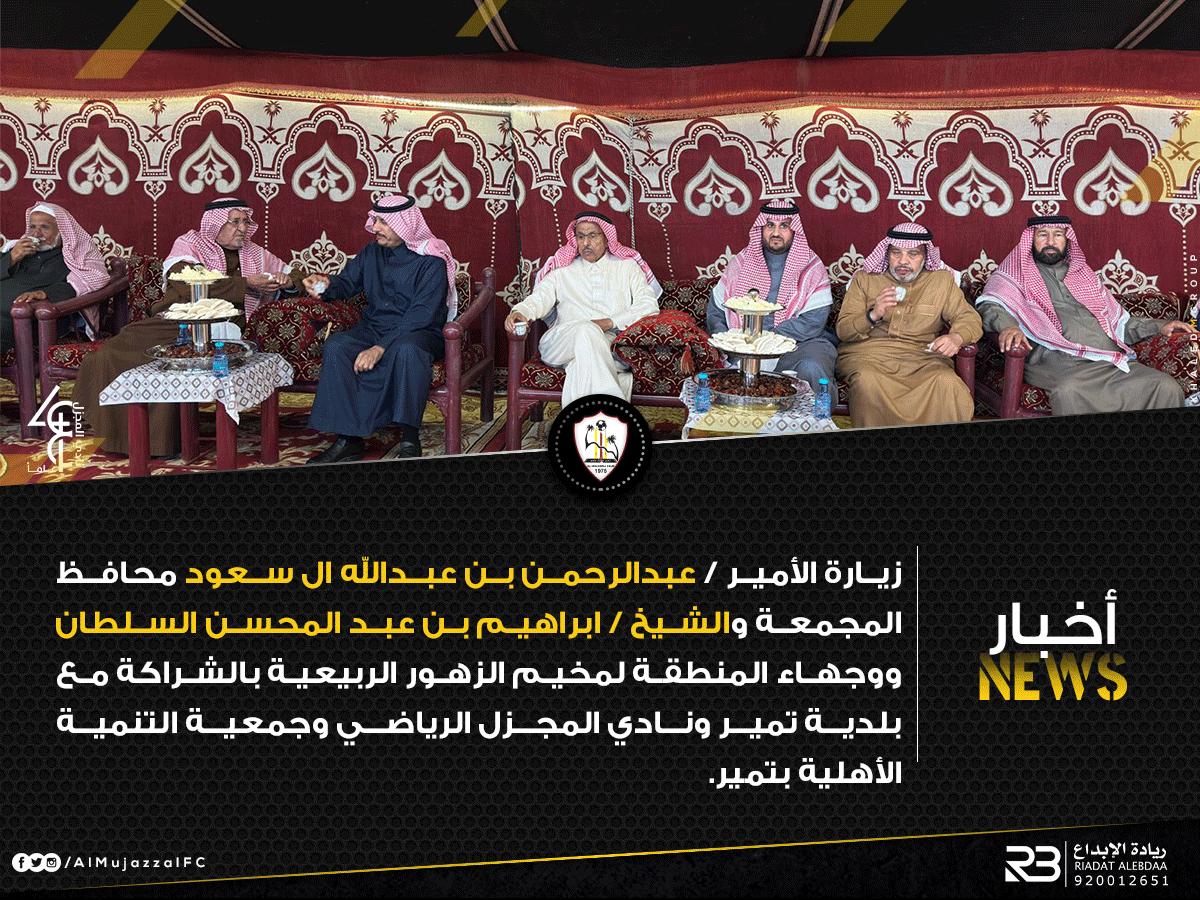 زيارة الأمير / عبدالرحمن بن عبدالله ال سعود محافظ المجمعة والشيخ / إبراهيم بن عبد المحسن السلطان ووجهاء المنطقة لمخيم الزهور الربيعية بالشراكة مع بلدية تمير ونادي المجزل الرياضي وجمعية التنمية الأهلية بتمير.
