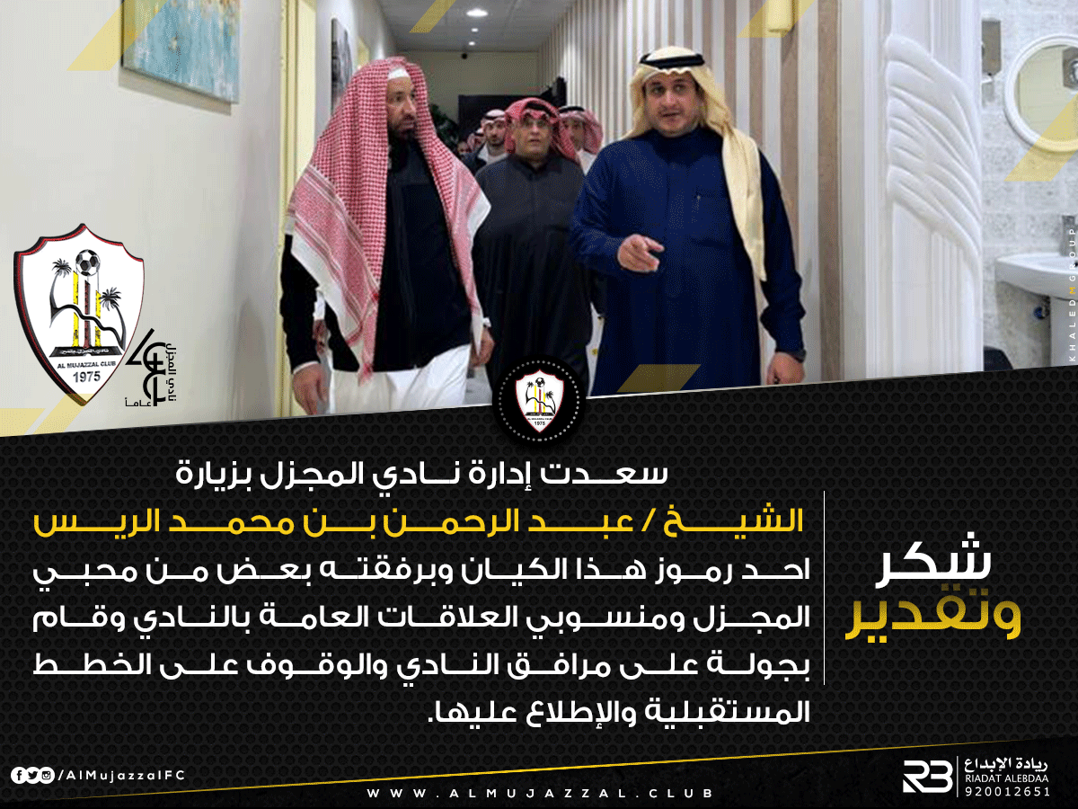 سعـــدت إدارة نـــادي المجزل بزيارة الشيــــــخ / عبــــــد الرحمـــن بــــن محمــــد الريـــــس احد رموز هذا الكيان وبرفقته بعض من محبي المجزل ومنسوبي العلاقات العامة بالنادي وقام بجولة على مرافق النادي والوقوف على الخطط المستقبلية والإطلاع عليها.