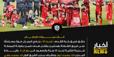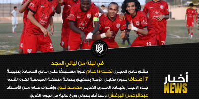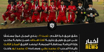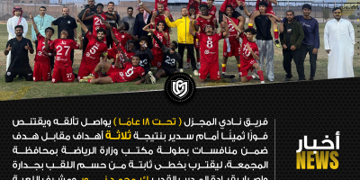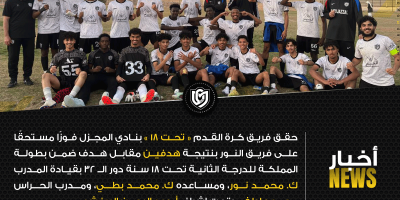 Read Moreفي ليلة من ليالي المجد حقق نادي المجزل تحت 18 عام فوزًا مستحقًا على نادي الحمادة بنتيجة 7 أهداف بدون مقابل ، توّجه بتحقيق بطولة منطقة المجمعة لكرة القدم جاء الإنجاز بقيادة المدرب القدير محمد نور، وإشراف عام من الأستاذ عبدالرحمن البرغش، وسط أداء بطولي وروح عالية من نجوم الفريق ألف مبروك للأبطال، ولنا الفخر…