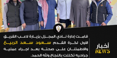 Read Moreقامت إدارة نادي المجزل بزيارة لاعب الفريق الأول لكرة القدم سعود سعد الربيع والاطمئنان على صحته بعد اجراء عمليه جراحيه تكللت بالنجاح ولله الحمد.