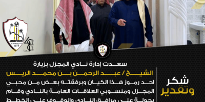 سعـــدت إدارة نـــادي المجزل بزيارة الشيــــــخ / عبــــــد الرحمـــن بــــن محمــــد الريـــــس احد رموز هذا الكيان وبرفقته بعض من محبي المجزل ومنسوبي العلاقات العامة بالنادي وقام بجولة على مرافق النادي والوقوف على الخطط المستقبلية والإطلاع عليها.