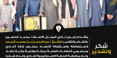 Read Moreيتقدم رئيس نادي المجزل الأستاذ/ محمد الحسين بالشكر والتقدير للشيخ / عبدالرحمن بن محمد الريس لاستضافته واستقباله لأعضاء مجلس إدارة النادي ومنسوبي العلاقات العامة بمنزله وإقامة مأدبة عشاء وتم مناقشة الخطة الاستراتيجية للنادي وقدم شكره ودعمه للرؤية وتقديم درع تذكاري لسعادته.